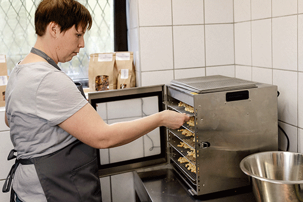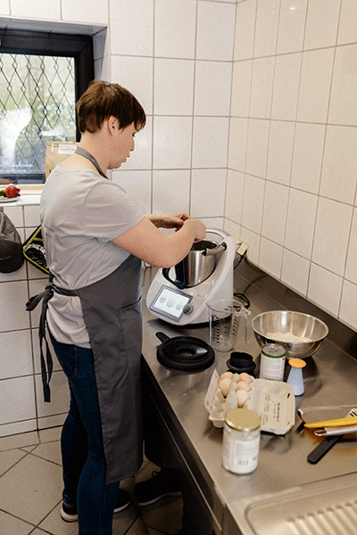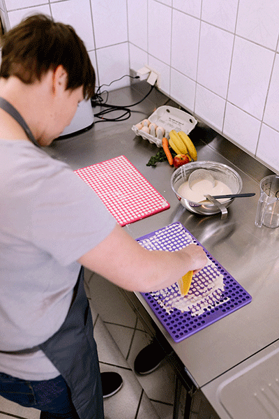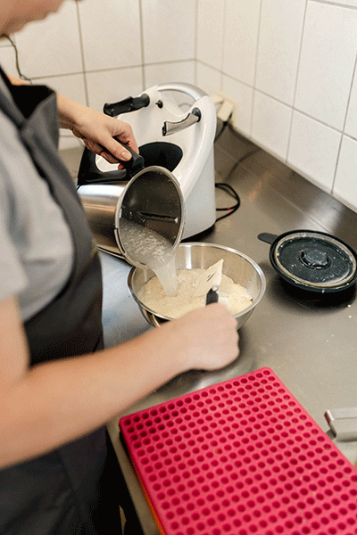 Zuerst werden die jeweiligen Zutaten je nach Geschmacksrichtung gereinigt, gewogen und zu einem Teig zusammengerührt.